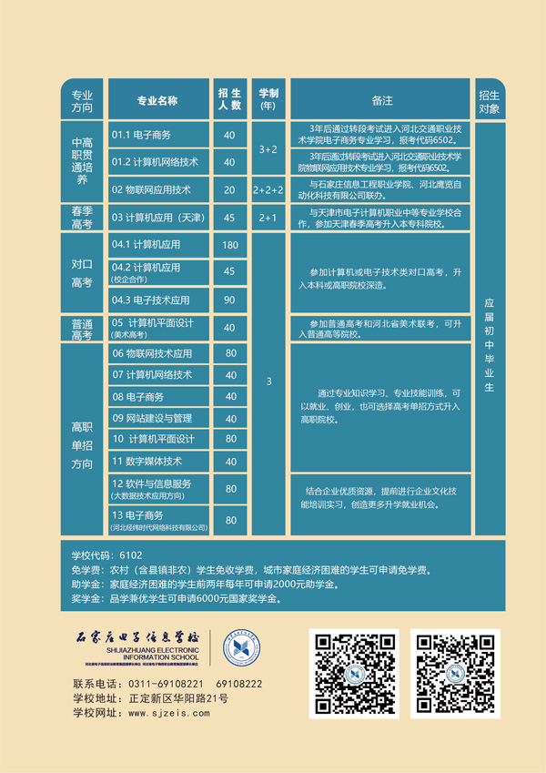 秉持秉持“办有温度的职业教育”的育人理念,学校持续深化“三教”改革,“岗课赛证”综合育人,不断提升教育教学质量。国家、省、市技能大赛,电子信息学子摘金夺银、载誉而归,自二零零七年起至今,我校三十余次代表河北省参加全国职业院校学生技能大赛,共获得奖牌三十余枚。特色评价、社团活动,激发学生向上向善正向能量;引企入校、现代学徒制,让学生与未来的岗位零距离。对口升学、美术高考,高职单招,为学生多元发展提供平台,一批批学生升入天津大学、天津中德应用技术大学、河北师范大学、河北科技师范学院,石家庄学院,河北工业职业技术大学等本专科院校继续深造,圆梦大学。